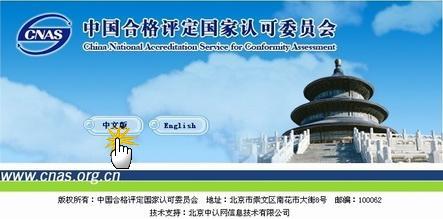 (三)通過國家認可委(CNAS)網(wǎng)站查詢 1、登陸CNAS網(wǎng)站www.cnas.org.cn,點擊“中文版”,進入國家認可委網(wǎng)站中文首頁;